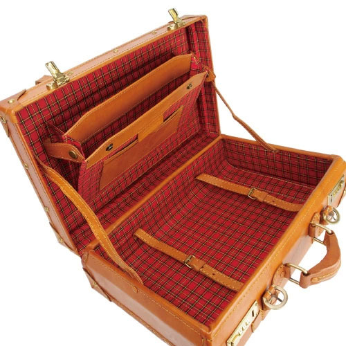 内装は温かみのあるチェック柄なので汚れも目立ちません。開いた時にフタ側を止める、両サイドの開き止めも革製です。仕切りがなく広々とした内装で、アイテムや着替えもたっぷり収納できます。またパッキングのための荷物ベルトが2つ付いています。A4ファイルなどにも丁度いいサイズなのでビジネスにもお使い頂けます。