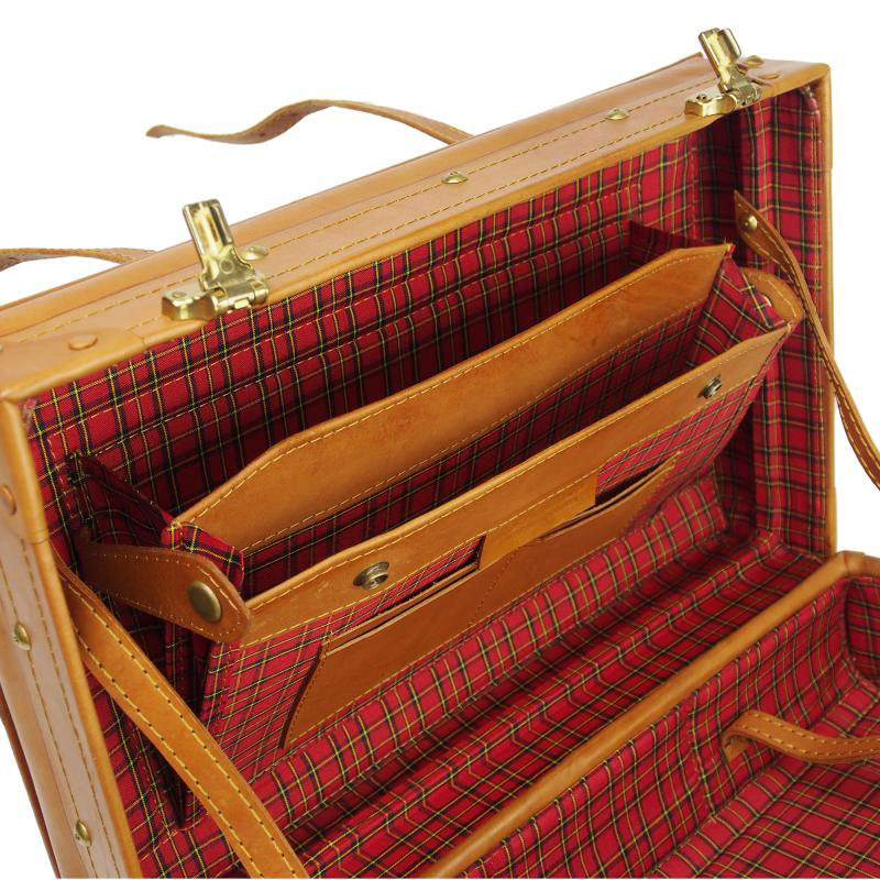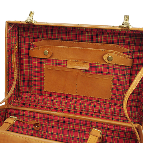 内装は温かみのあるチェック柄なので汚れも目立ちません。開いた時にフタ側を止める、両サイドの開き止めも革製です。