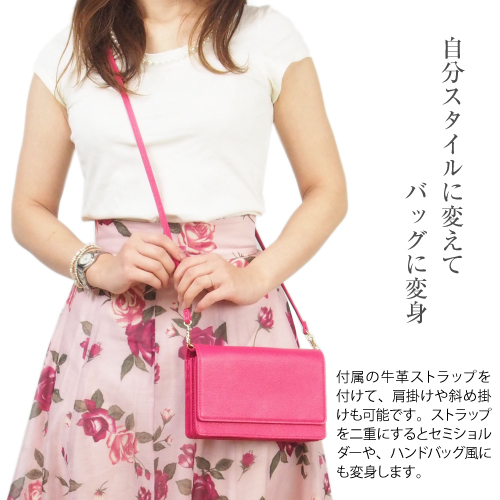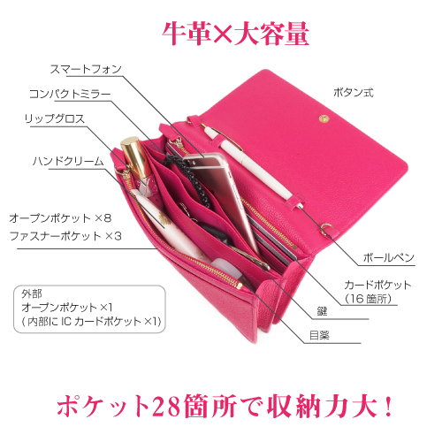 付属の牛革ストラップを付けて、肩掛けや斜め掛けも可能です。ストラップを二重にするとセミショルダーや、ハンドバッグ風にも変身します。両手が空くからとにかく便利で、ちょっとしたお出かけや旅行にも活躍します。また、ショルダーは細いので持つ女性を華奢に見せてくれる効果があります。洋服も選ばず様々なシーンでお使え頂けます。 スマートフォンまで入る、こだわりの大容量!何といってもこの財布は大容量です。オープンポケット×8、ファスナーポケット×3、カードポケット×16と、豊富なポケットに整理整頓して必要最低限のものをまとめて持ち歩くことが出来ます。