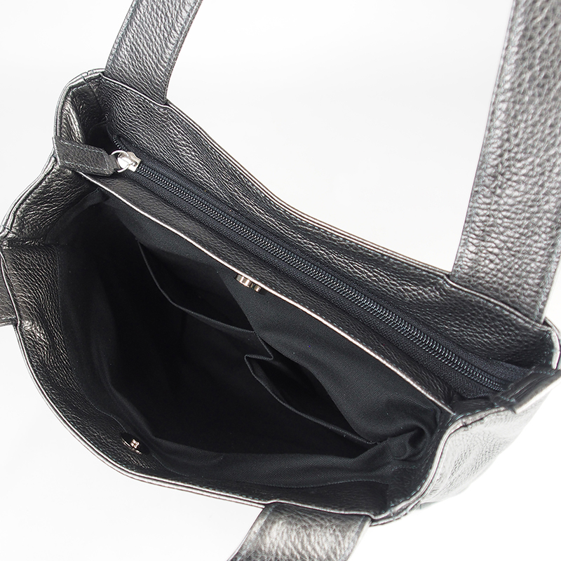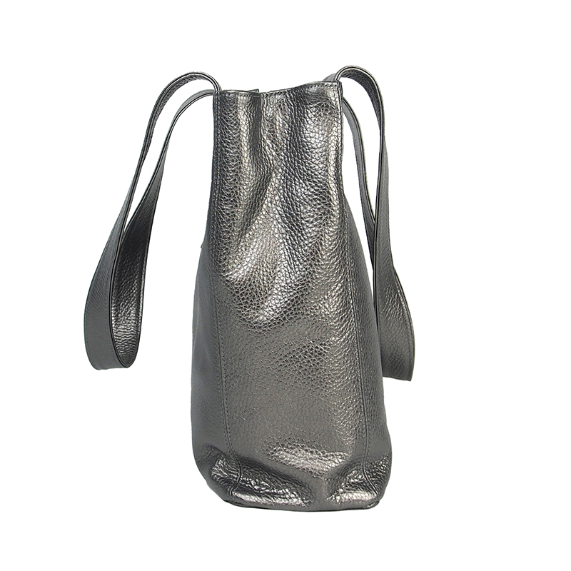 側面から見るとマチがあってもスマートな印象で、ハンドル部分も少し長めで幅広の柔らかい革なので、肩にあまり負担をかけずに楽にご使用頂けます。お出かけなどにお勧めで、500mlペットボトルも立てて入れられます。