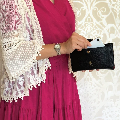 カード収納ポケットも充実の装備。またスマホの収納もボタンホックなのでサッと出し入れしやすく使いやすくて安心です。毎日使うものには丈夫で劣化しにくく長持ちする本革がおすすめ。また母の日など贈り物にも最適です。