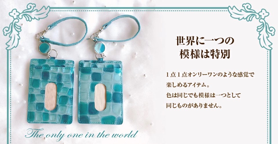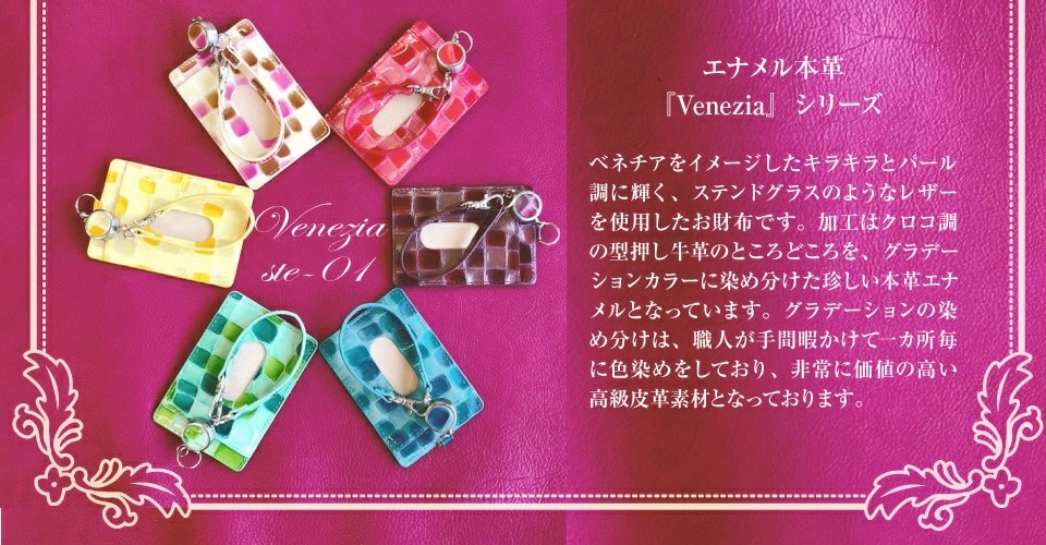 ベネチアをイメージしたキラキラとパール調に輝く、ステンドグラスのようなレザーを贅沢に使用したパスケースです。
