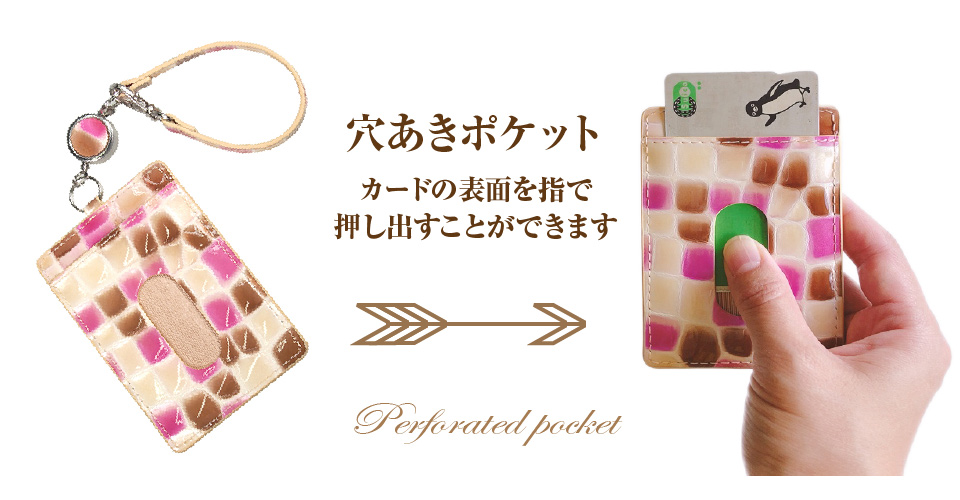 もう一つのポケットは中心に穴があります。カードの一部が見えますので、どのカードを入れているか一目でわかります。また、カードの表面を指で押し出すことができます。ナイロン製の生地なのでスライドしやすくスムーズに取り出せて便利です。suicaやPASMO、Kitaca、ICAS、TOICA、manaca、PiTaPa、ICOCA、SUGOCA、はやかけん、nimoca、楽天Edy、WAON、Tカードなど、磁気カードやポイントカードなどにご利用いただけます。