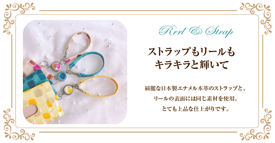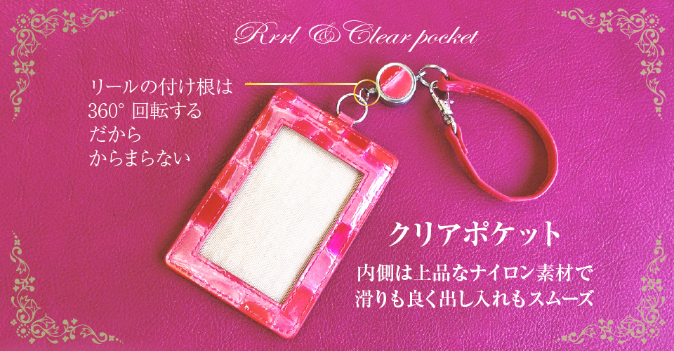 引っ張ると最大で40cmほど伸びるリールが装備されています。鞄にパスケースを取り付けているときに、鞄から外さなくてもリールを伸ばせば改札タッチが可能です。ICカードを探す時間が省かれ、スマートに行動することができます。電車に乗り遅れそうなときにも大活躍です。リールホルダーの表側にはお揃いの共革があしらわれています。