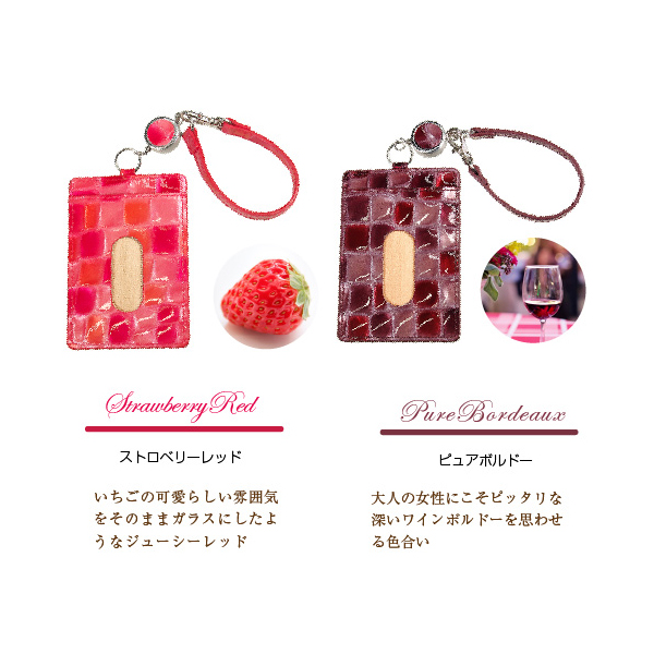 エナメル本革を使用し、キラキラと輝くステンドグラス調のガラス細工のようなカラフルなバリエーション展開が魅力です。シーンによって使い分けたり、色違いで大切な人とお揃いで持つことも出来ます。