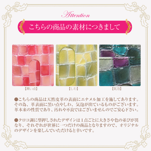クロコ調の型押し牛革のところどころを、グラデーションカラーに染め分けた珍しい本革エナメルを使用しています。