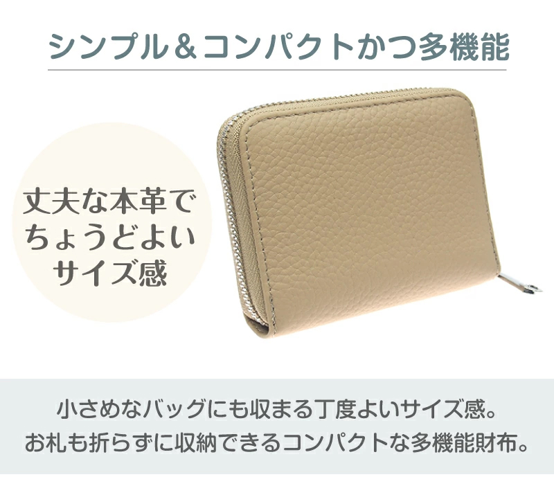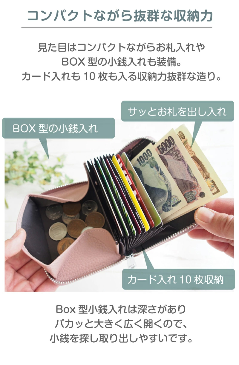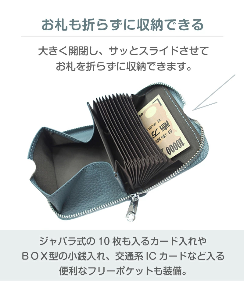 小さめなバッグにも収まる丁度よいサイズ感ながらお札も折らずに収納できるコンパクトな多機能財布。キャッシュレス時代に必要最低限の現金を持ちたい方やご旅行にもおススメです。お札を折らずに収納でき、ジャバラ式の10枚も入るカード入れやBOX型の小銭入れ、交通系ICカードなど入る便利なフリーポケットも装備。スキミング防止機能付きなので安心です。質の良い本革の仕様で長くご愛用いただけます。プレゼントにもおすすめです。
