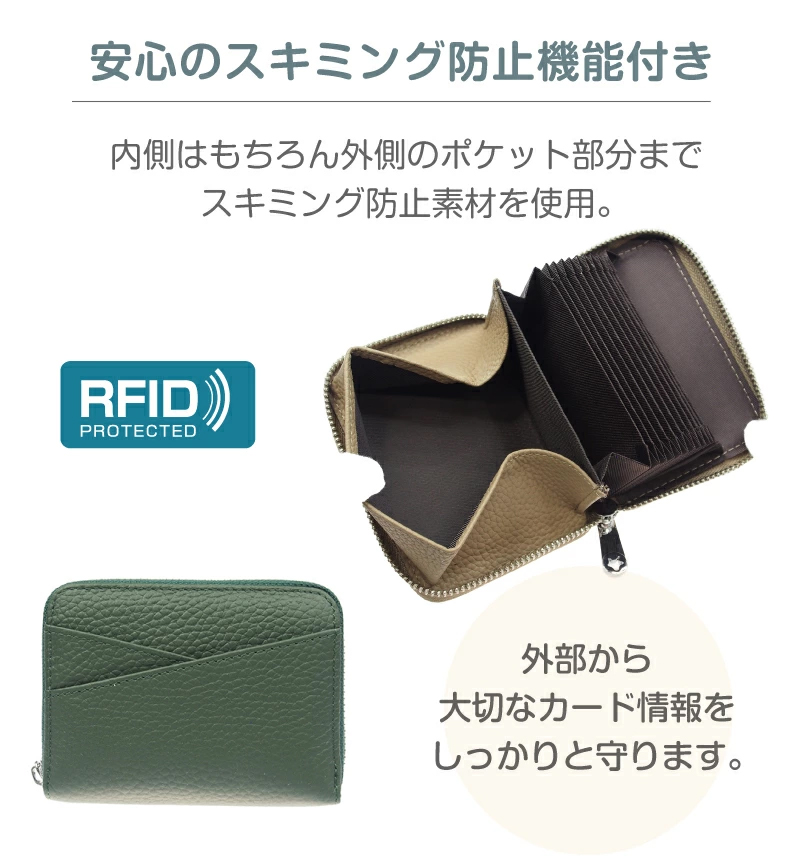 内側はもちろん外側のポケット部分までスキミング防止素材を使用しているので、外部から大切なカード情報をしっかりと守ります。