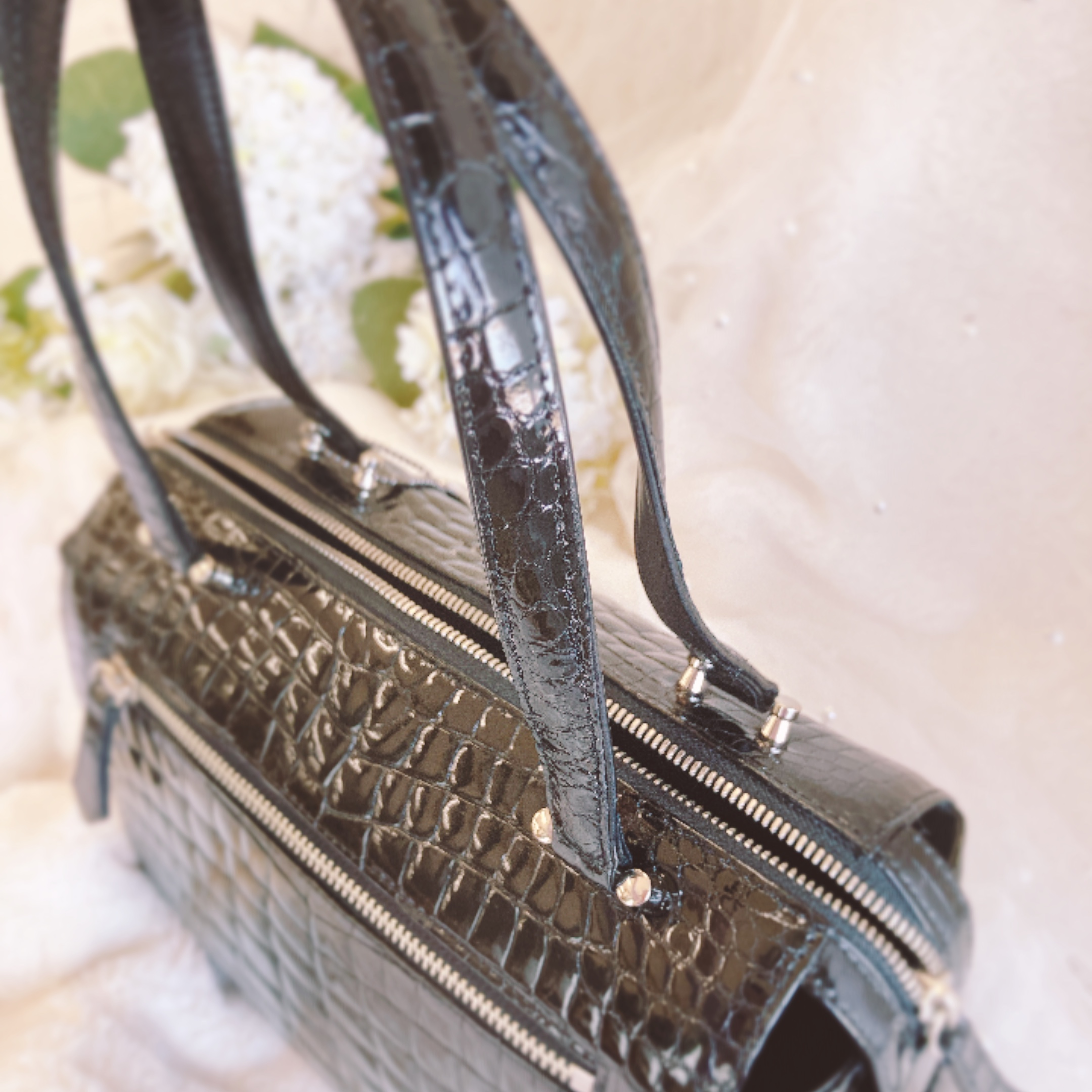 【日本製】 センター取り クロコダイル 本革 シャイニング加工 ハンドバッグ 肩掛け 天ファスナー JRA Made in Japan 軽量 BLACK ブラック