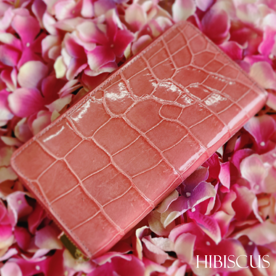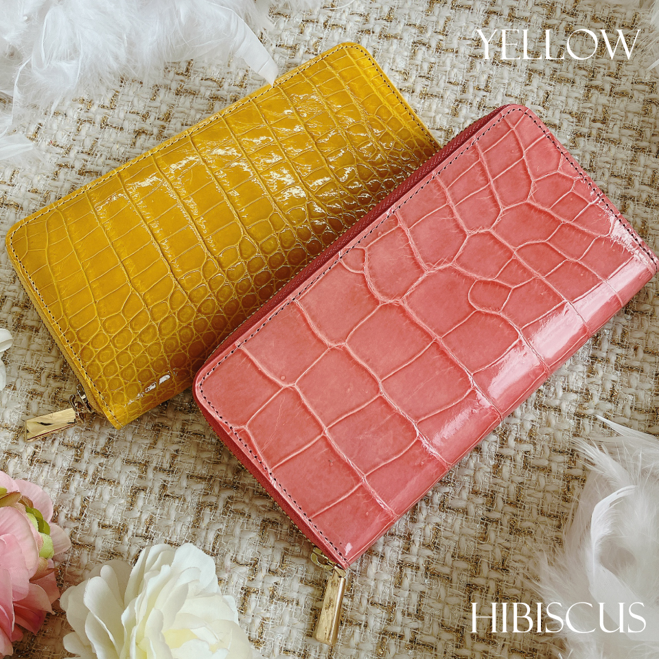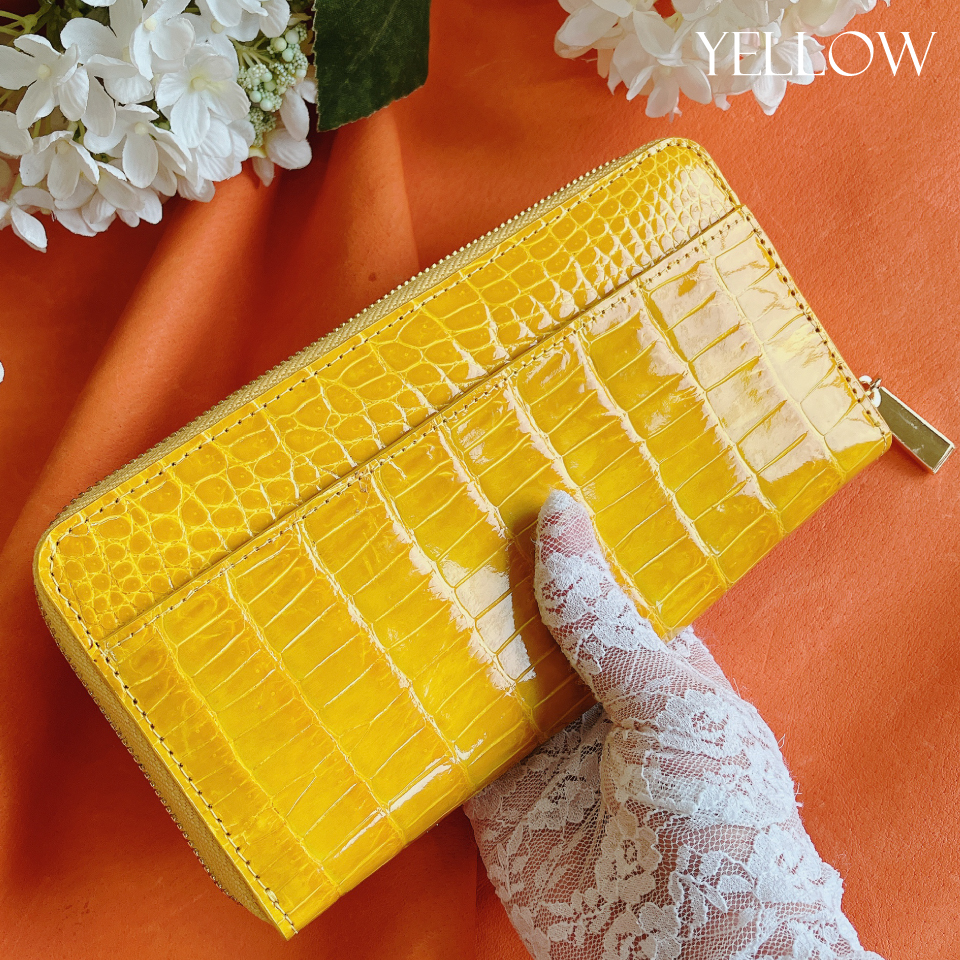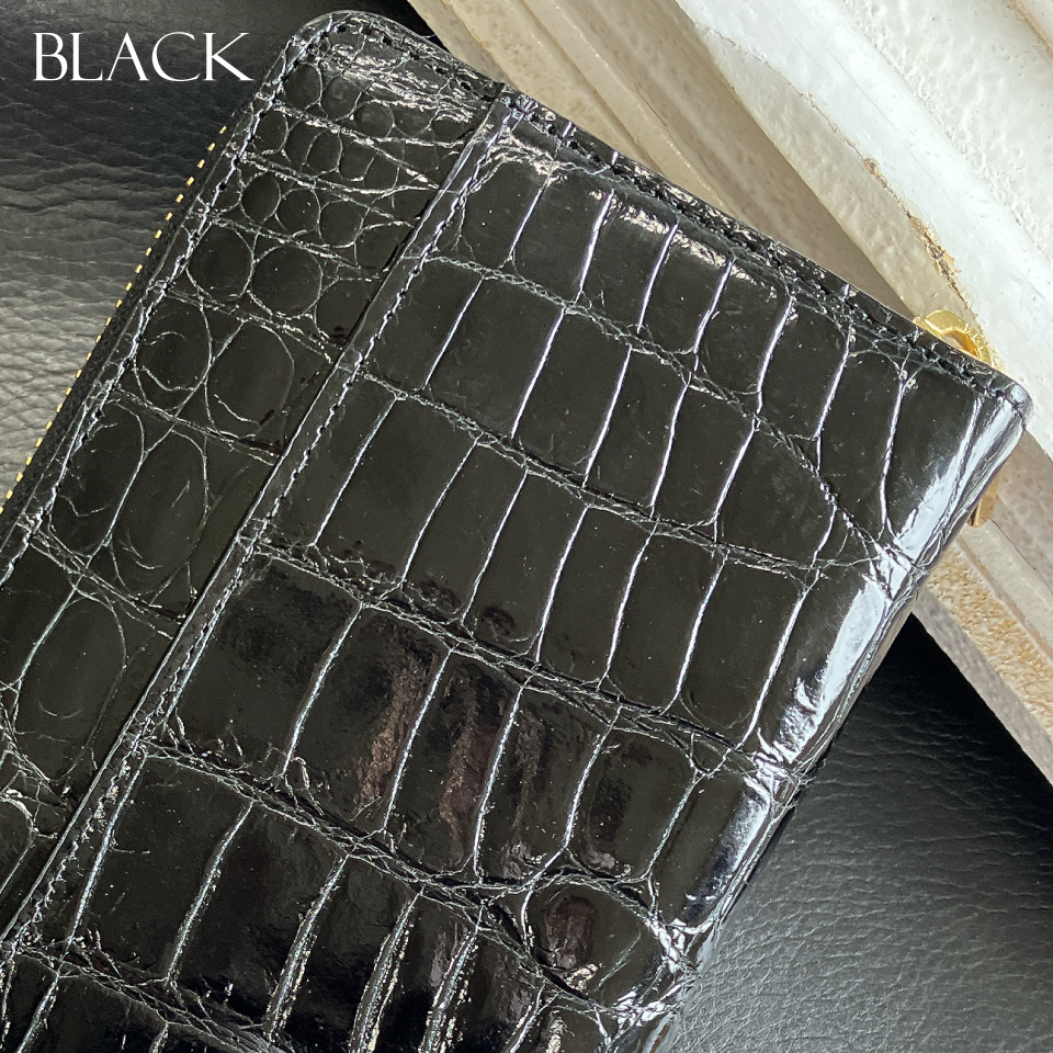 その美しさから「皮革の宝石」と言われる天然素材のクロコダイルを贅沢に使用したラウンドファスナー長財布です。ゴールドのファスナーとチャームで高級感も漂います。見た目の綺麗さだけではなく、収納力にも優れ機能性もあり、大変使いやすい財布となっています。