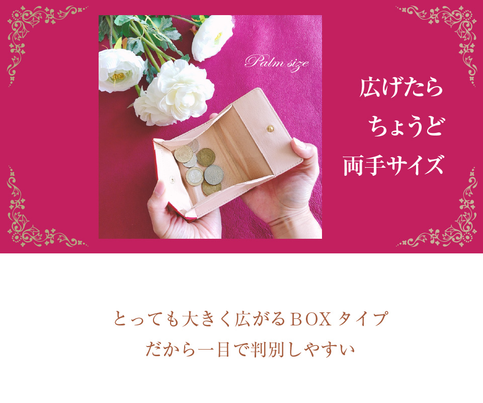 コンパクトな造りながら、ボックス型の小銭入れも装備。安心して小銭も多めに収納できます。大きく開閉するので一目で見えて取り出しやすく会計の時も使いやすくて便利です。
