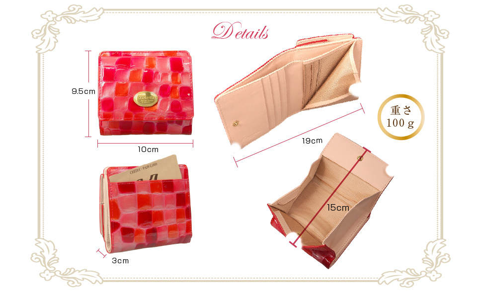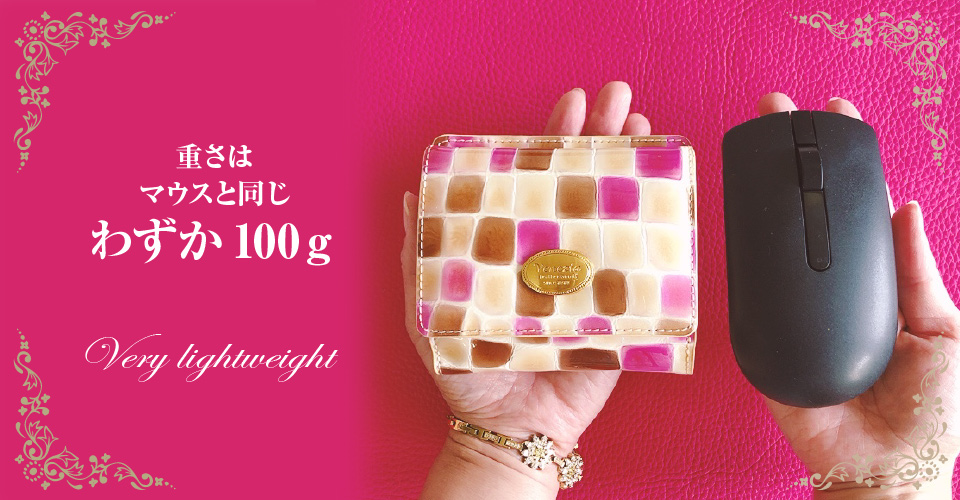 艶々の可愛いさと機能的な使い心地を楽しめます。コンパクトなのにカードもしっかり10枚収納でき、しかも小銭が取り出し易いBOX型になっているお財布。質の良い日本で加工した上質なエナメル本革の仕様で、バッグの中でも見つけやすいサイズです。わずか100gでとても軽くて持ち歩きやすいです。