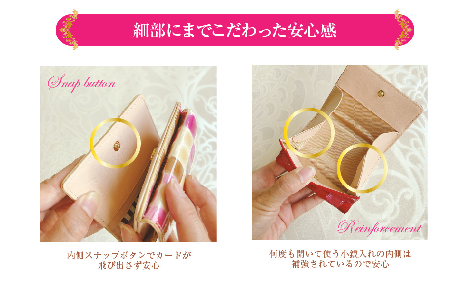 お財布にボリュームが出たときもスナップボタンで留めて頂くことで安心して収納出来ます。