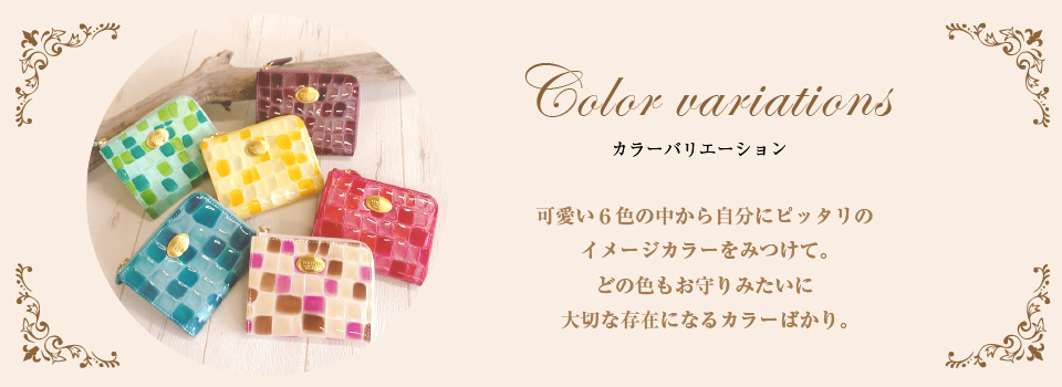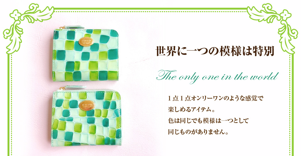 エナメル本革を使用し、キラキラと輝くステンドグラス調のガラス細工のようなカラフルなバリエーション展開が魅力です。シーンによって使い分けたり、色違いで大切な人とお揃いで持つことも出来ます。