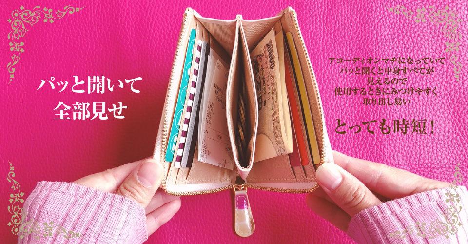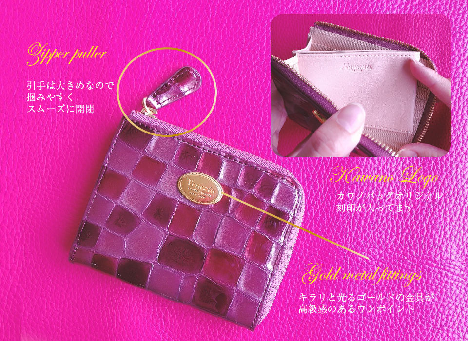 お財布にボリュームが出たときもL字ファスナーでしっかりと留めて頂くことで安心して収納出来ます。