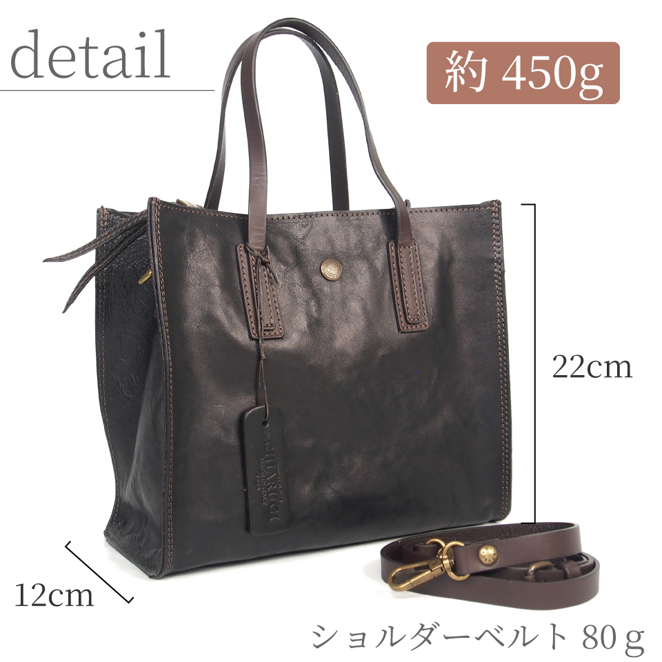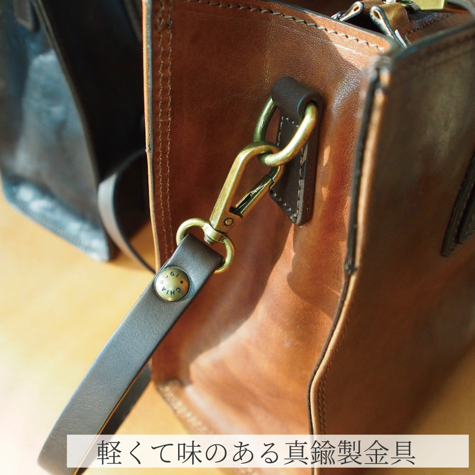 ロゴマークやDカン、引手、バックルなどの金具部分はオールドトスカーナのイメージに合う、やや黒味を帯びた味のある真鍮製です。重さも軽めで疲れにくい仕様です。