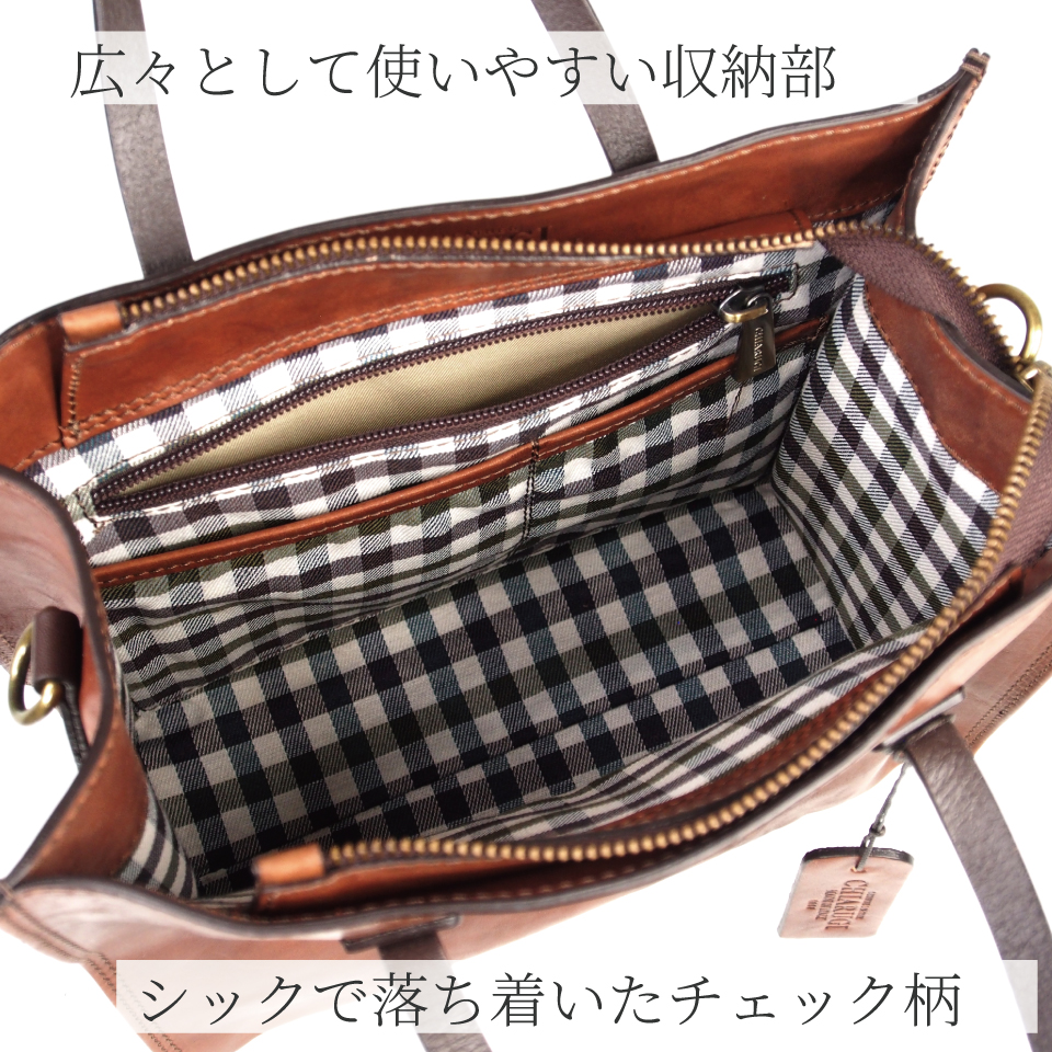 内装は全面にブルーとグリーンのシックで落ち着いたチェック柄で荷物も見やすい造り。内部背面のファスナーポケットは大きめでスマホや貴重品も入り便利です。キアルージオリジナルの引手も大きめなので使いやすい造り。2つのフリーポケットとファスナーポケットには革のパイピングがしっかりしてある職人拘りの造りです。
