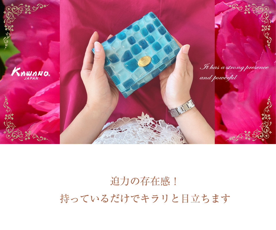 お洒落なデザインで宝石のような輝きのお財布です。金具もキラリと光るゴールドで高級感のあるワンポイントとなっています。