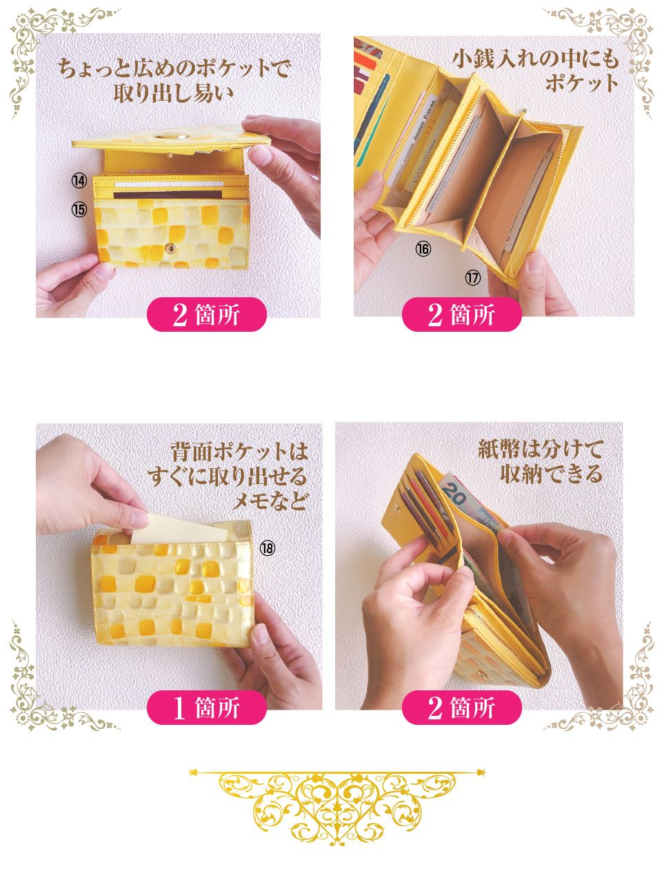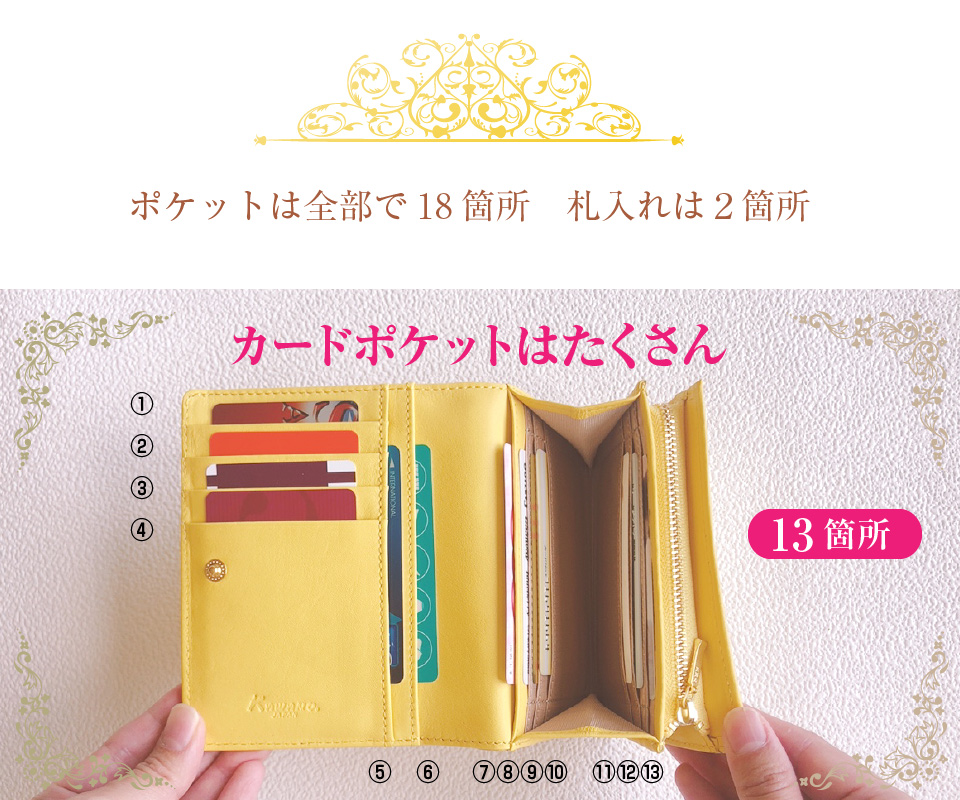カードの収納部分は縦にも入れられるのでよく使うカードは見やすく取り出しやすくなっています。折り財布ながらカードポケットは18ヶ所も装備されています。カードをたくさん持ちたい主婦やOLさんにぴったりの豊富な収納機能です。また、お財布にボリュームが出たときもスナップボタンで留めて頂くことで安心して収納出来ます。