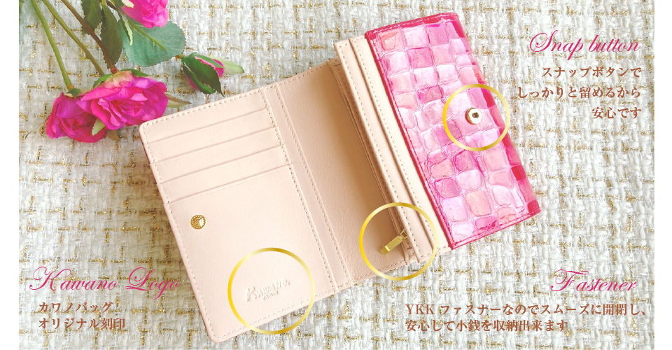上質なエナメル素材は持っているだけでキラリと光る存在感があります。バッグから取り出し、会計時にスナップボタンを一つ外すだけのスムーズな動作で、カードや紙幣の取り出しが出来ます。