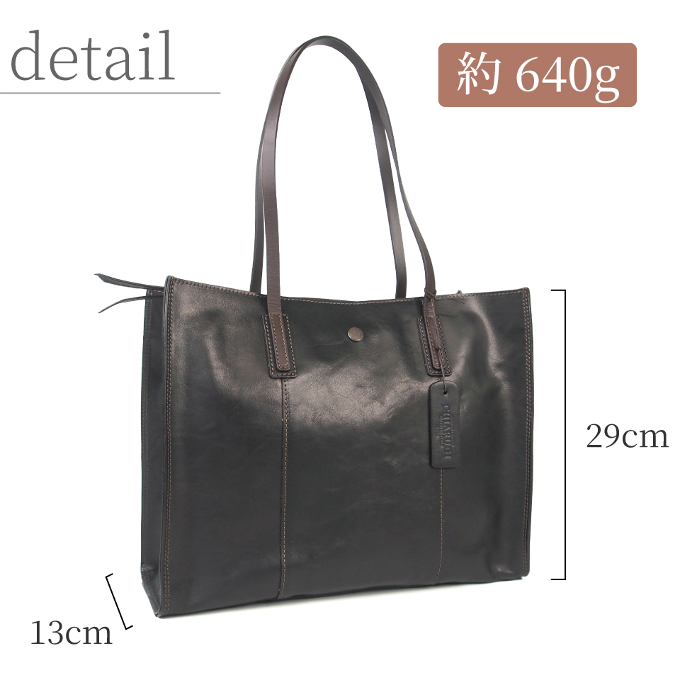 やや硬めの本革なのでしっかりと形状を保ち、自立するので荷物の出し入れも楽です。やや長めのハンドルも肩に掛けられるので長時間のご使用も疲れにくい造りです。