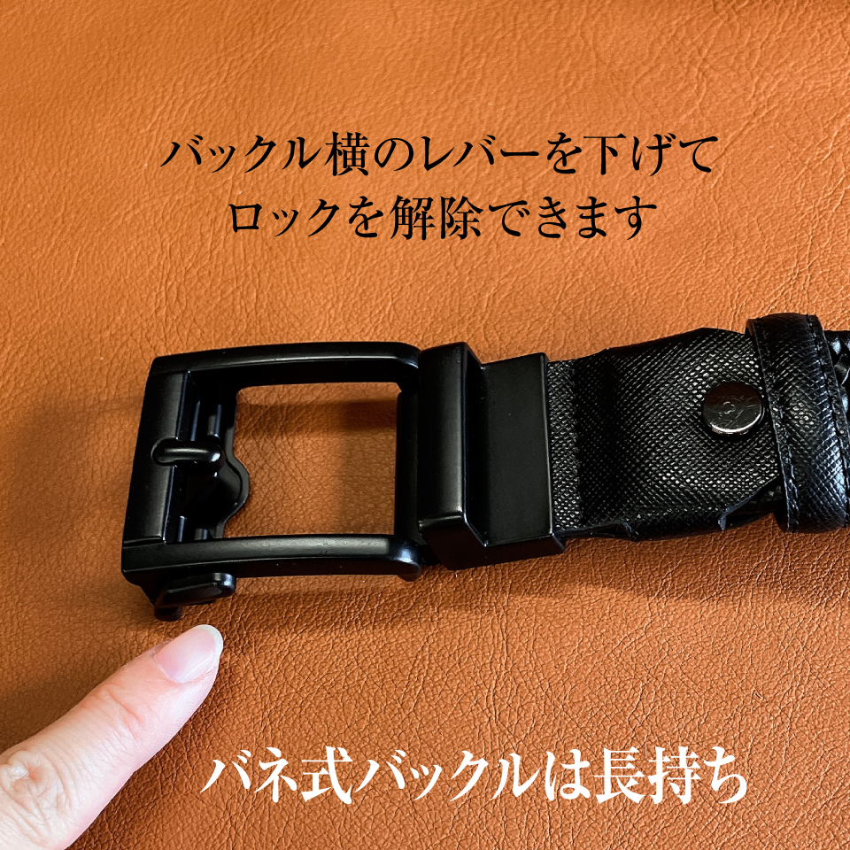 裏面にある39段階のトラッキングシステムによって、ベルトをバックルに通して好きな所までスライドさせ、カチッと留めるだけです。ベルト穴がないので劣化しにくく、革を傷める心配が少ないので長くご愛用いただけます。普通のベルト穴は5つくらいなのに対して、約8倍も調節度合がアップします。