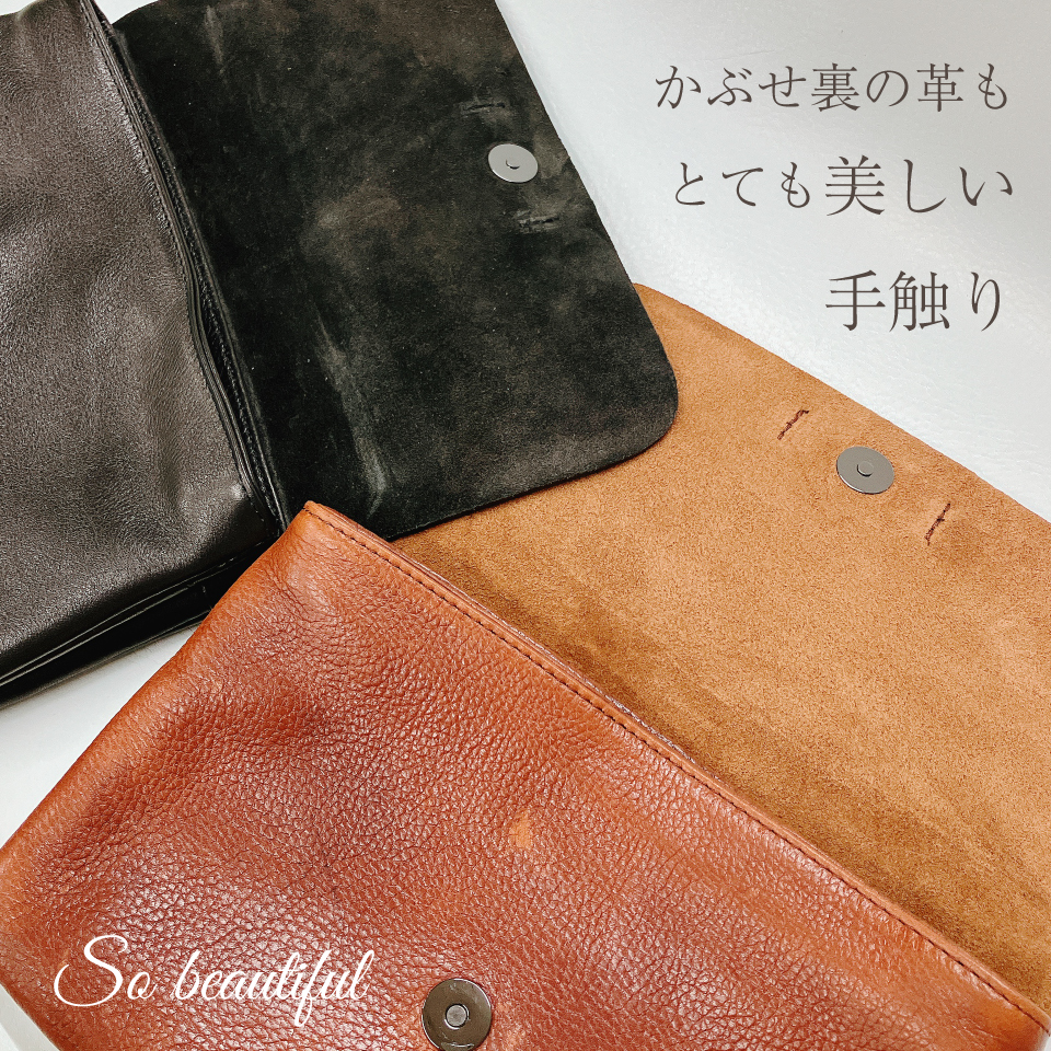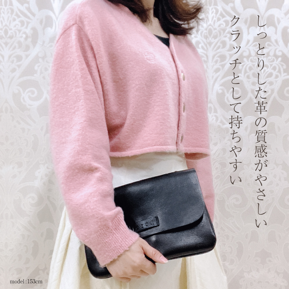 角は丸みがあり横長のシンプルなデザインで、クラッチタイプにもショルダーベルトを付けて肩掛けタイプにも出来るバッグ。収納はファスナー付きとかぶせ式の2層構造で、仕分けができるので荷物の整理にも便利です。使い勝手も良く、コンパクトながらしっかりと必要なものが入るサイズです。イタリア製の柔らかで手触りの良い上質な革が特徴。ビアンコ・クオイオ・ネロの3色展開。ビアンコとクオイオはタンポナートレザーを使い染色の仕方に独特な魅力があります。ネロは生後6ヵ月以内の子牛の革、カーフスキンをつかっています。カーフレザーはとても薄くて柔らかく軽い革です。きめが細かくて、すべすべな質感も人気のポイントです。
