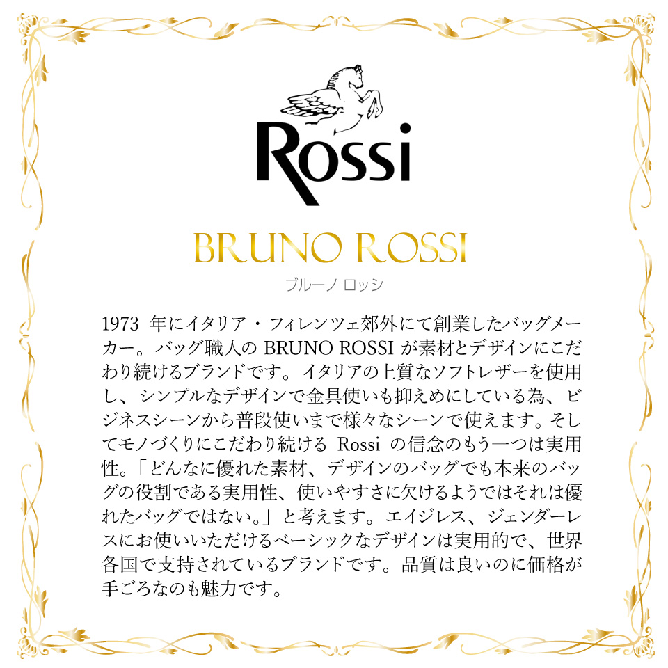 1973年にイタリア・フィレンツェ郊外にて創業したバッグメーカー。バッグ職人のBRUNO ROSSIが素材とデザインにこだわり続けるブランドです。イタリアの上質なソフトレザーを使用し、シンプルなデザインで金具使いも抑えめにしている為、ビジネスシーンから普段使いまで様々なシーンで使えます。 「どんなに優れた素材、デザインのバッグでも本来のバッグの役割である実用性、使いやすさに欠けるようではそれは優れたバッグではない。」バッグというモノづくりにこだわり続けるRossiの信念です。使いやすくカジュアルなラインのバッグを得意として、品質は良いのに価格が手ごろなのも魅力です。長く使い込むほどに風合いが増す素材とベーシックなデザインで、エイジレス、ジェンダーレスにお使いいただけます。