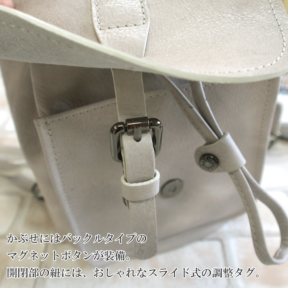 かぶせにはバックルタイプのマグネットボタンが装備。開閉部の紐には、おしゃれなスライド式の調整タグが付いています。かぶせを開くと外側前面にはサッと取り出せる便利なフリーポケットがあります。背面のサイドには縦のファスナ-式のポケットが装備。 旅行やお出掛け時には貴重品やパスポート等安心して収納できます。