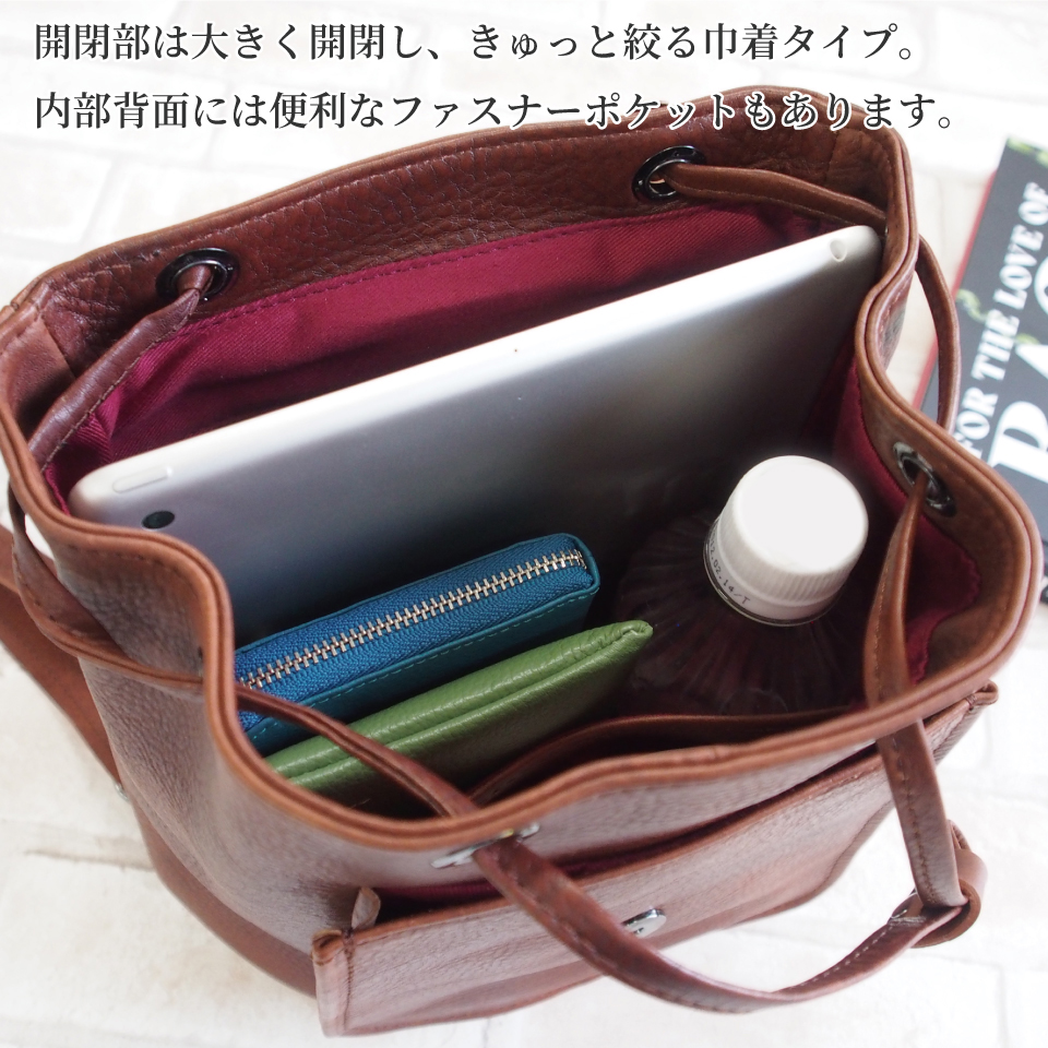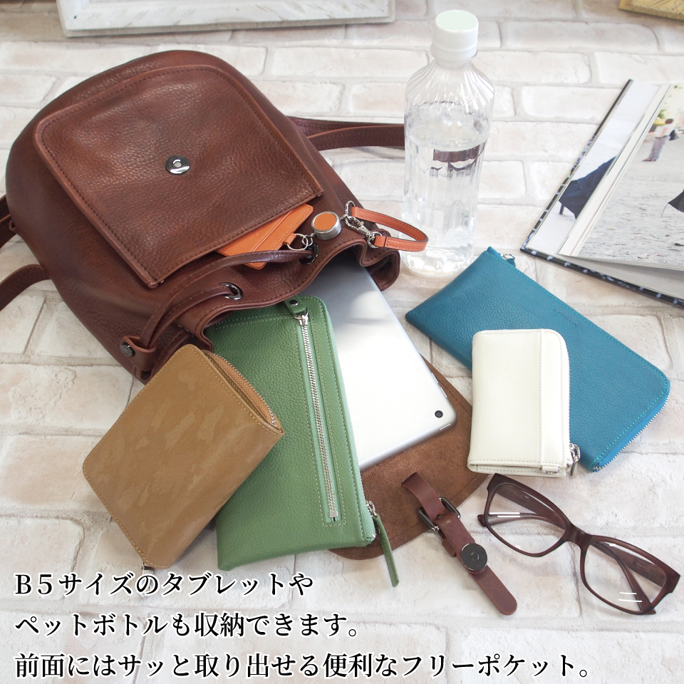 肌馴染みの良い柔らかくで丈夫なレザーは程よい硬さでしっかりとした形状を保っています。開口部は巾着絞りで大きく開き使いやすい造りです。内部はコンパクトながら広々としており、マチも十分あるのでお出掛けに必要な長財布やスマホ、ポーチなども入れられ収納力も抜群です。かぶせを開けると前面にはマチ付きのファスナーポケットがあり、小物などが収納できます。