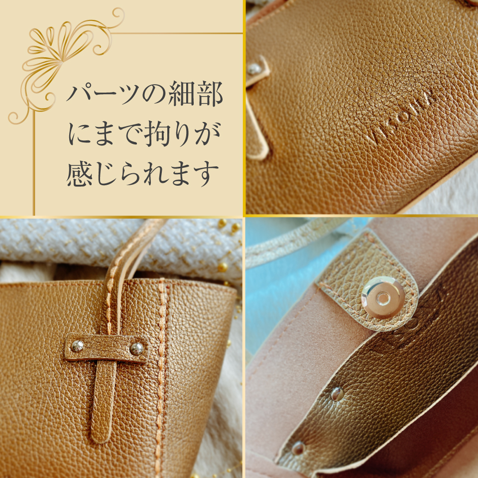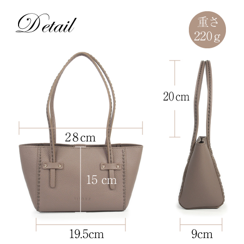 表面の牛革シュリンクはしっとりとした肌ざわりがとても上品です。柔らかいしぼが手触り良く、イタリアの本革ならではの質の良さを感じます。また、絶妙なイタリアンカラーの色使いが素敵です。外側はすべて牛革のおしゃれなパーツの組み合わせで、アクセントとなるプリニオヴィソナのステッチが入り、緩やかにカーブした持ち手と本体が個性を表現しています。持ち手は長く肩掛けができるタイプです。脇にかかえてもスマートに収まります。 ※モデル写真参照