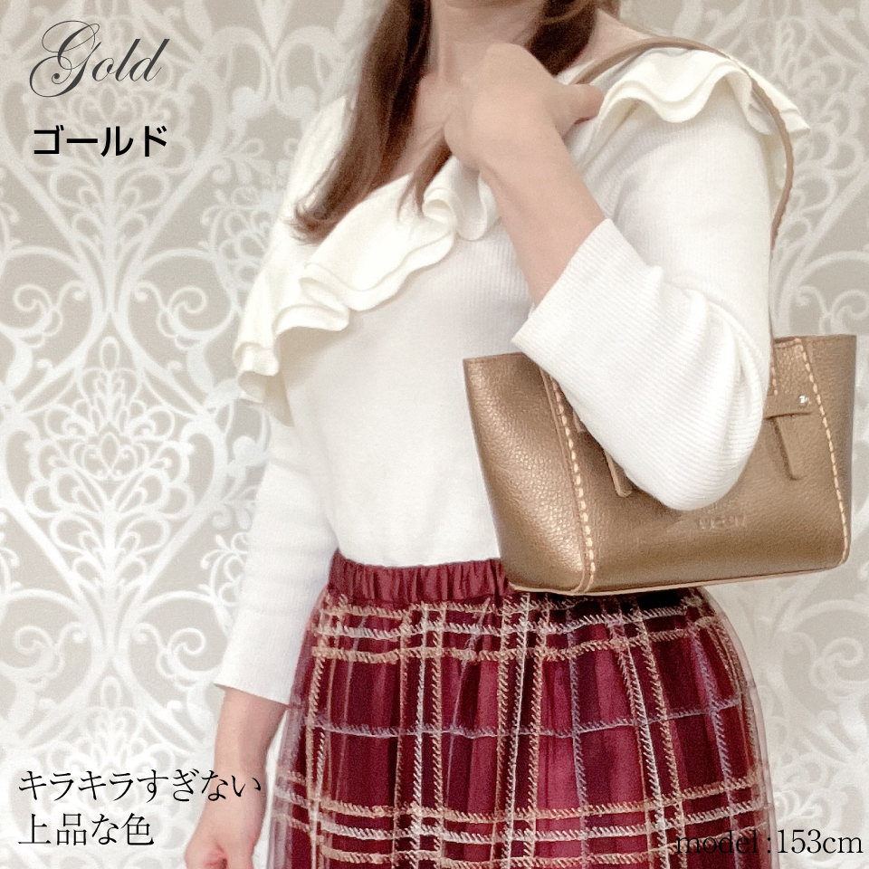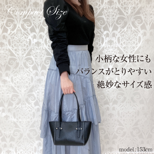 上部のマグネットボタンがいい音でぴったりと閉まり、中身が簡単に見えない安心な造りです。横から見て三角形の本体はコンパクトに、持ち手の長い部分は立ち上がりも良く、スマートに脇に収まるバランスのいいフォルムです。スカートスタイルにもパンツスタイルにも合わせ易いサイズ感です。コンパクトなので、日本人のように小柄な女性にもぴったりです。
