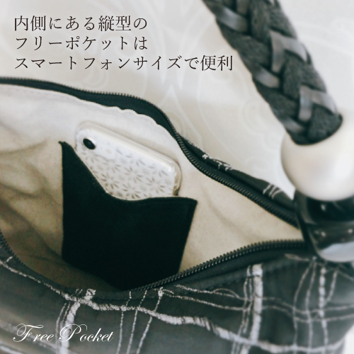 内側前面に付いているフリーポケットは牛革で出来ていて、中の布地と素材が異なるのでバッグを開けたときにもおしゃれです。