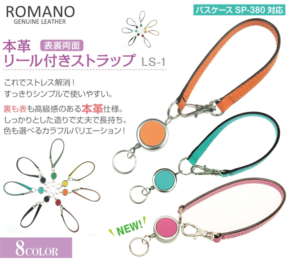 【メール便送料無料】 リール付きストラップ パスケース 鍵 牛革 ROMANO(ロマノ) LS-1 キイロ ローズピンク アカ オレンジ グリーン スカイブルー ネイビー ブラック