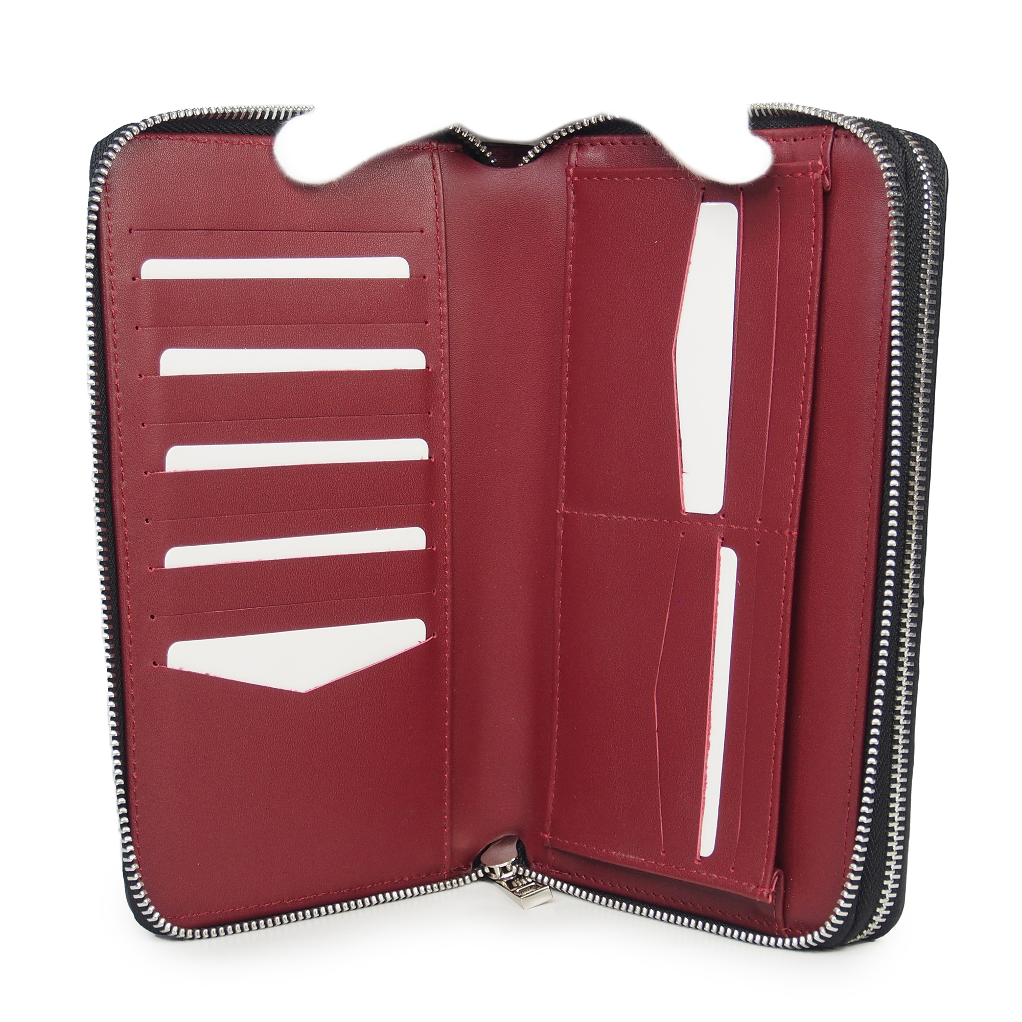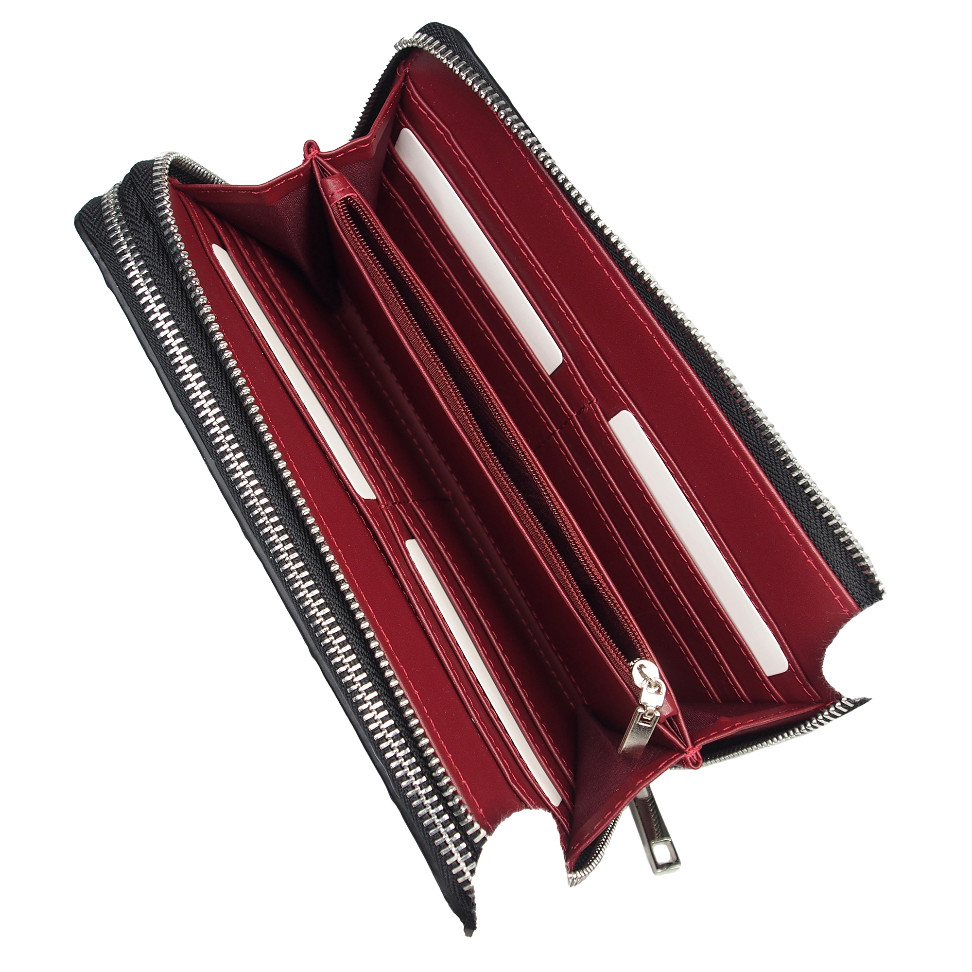 | 内装 | 【財布収納部】 カードポケットx12 フリーポケットx両サイド各1 中央ファスナー式小銭入れ 札入れx2 【カード収納部その2】 マチ付きフリーポケットx1 カードポケットx16 |