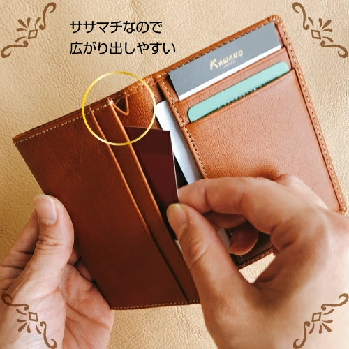 ササマチ付きの収納部分は、収納量に合わせて広がります。折りたたんだお札はもちろんカードもたくさん収納出来ます。名刺は約40枚収納しても型くずれしません。