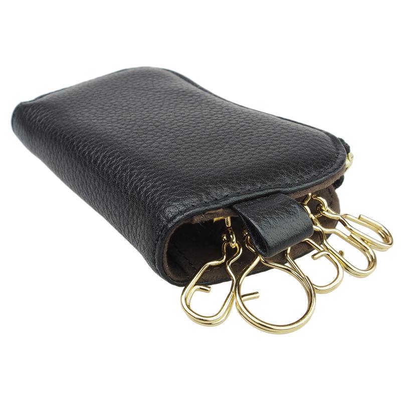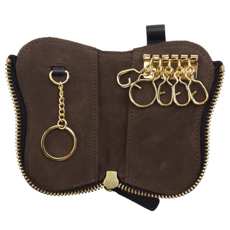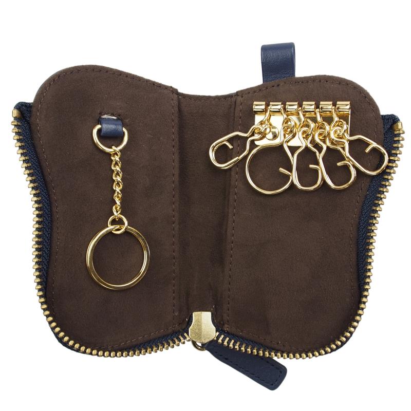 ファスナーを開くと、左側にはチェーン付きリングがあります。車の鍵や家の鍵など、使用頻度の高いカギを付けると便利です。また、ぶら下げて保管したい場合にも、使用することができます。
