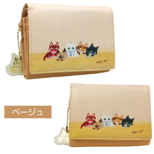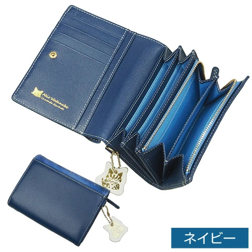 ★必ずもらえる牛革チャーム★二つ折り財布 本革 大容量 牛革 L字ファスナー式小銭入れ付き 札入れ アコーディオンマチ カワノバッグ 猫チャーム付き 渡辺あきお 猫イラスト WA-009