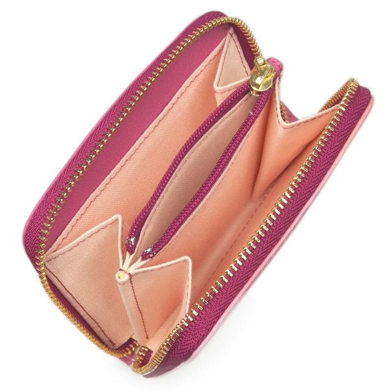 コンパクトながら収納機能が充実しているラウンドファスナーの小銭入れ。マチ付きなので広めに開閉し小銭も充分入ります。