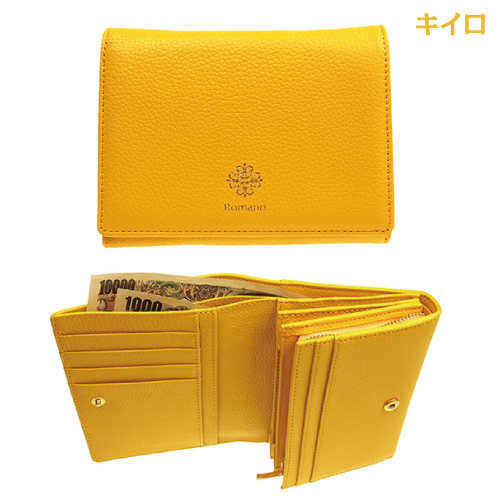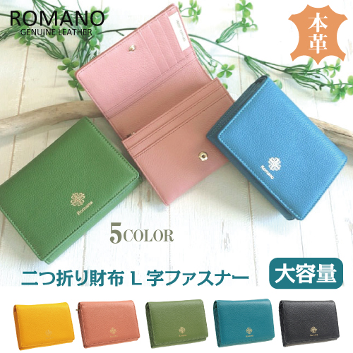 二つ折り財布 牛革 本革 大容量 L字ファスナー式小銭入れ付き 札入れ アコーディオンマチ ROMANO(ロマノ) 5304 キイロ ピンク ブルー グリーン クロ