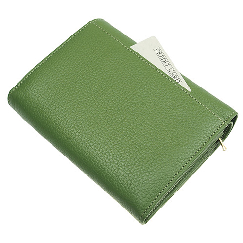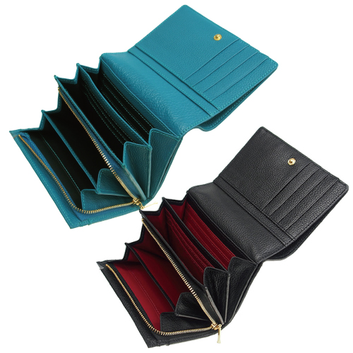 スナップボタンを開けるとカードの収納部分です。縦にも入れられるのでよく使うカードは見やすく取り出しやすくなっています。折り財布ながらカードは約18枚も収納可能でフリーポケットは6ヶ所で合わせて24ヶ所のポケット収納があります。カードをたくさんもっている主婦やOLさんにもぴったりの豊富な収納機能です。お財布にボリュームが出たときもスナップボタンで留めて頂くことで安心して収納出来ます。