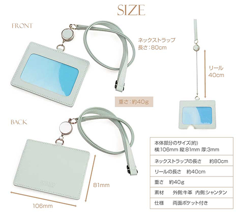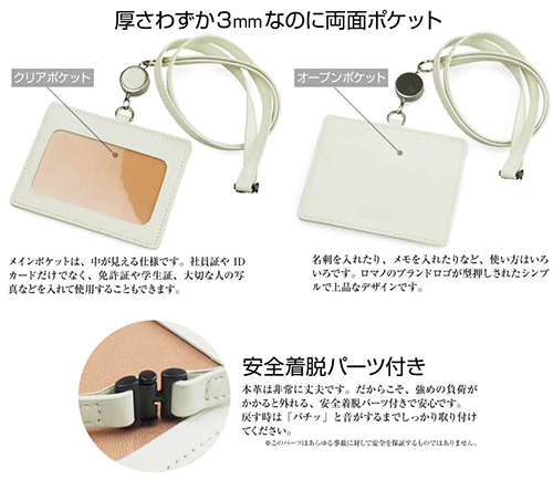 楽天ランキング(パスケース部門)週間1位を連続した人気のロマノパスケースシリーズに、待望のICカードケースが仲間入りしました。社員証や入場証など、仕事やイベントなどで活躍。リール付きなのでICカードを掲示するゲートでも、外さずに伸ばすだけでタッチできるので便利です。また、Yシャツやブラウスに合わせやすい明るいパステル調が特徴、さわやかなカラーラインナップです。もちろん、細部までこだわりの牛革を使用。ネックストラップは、本革で丈夫だからこその安全対策もしています。