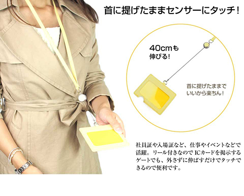 リールが伸びて、スムーズに出入り引っ張ると最大で40cmほど伸びるリールが装備されています。首にパスケースを提げているときに、外さなくてもリールを伸ばすだけでセンサーへタッチが可能です。
