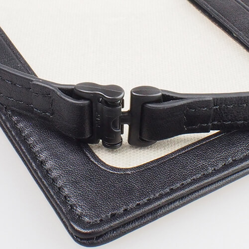 負荷がかかると外れる、安全ネックストラップ本革は非常に丈夫です。だからこそ、強めの負荷がかかると外れる、緊急装置があります。