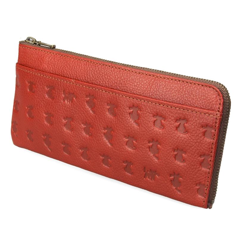 【メール便送料無料】L字ファスナー長財布 牛革 日本製 猫柄型押し CA-5 キャメル チャ ワイン クロ