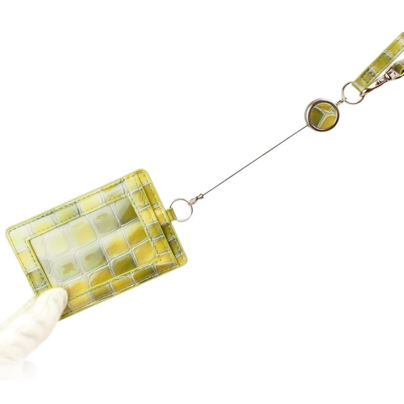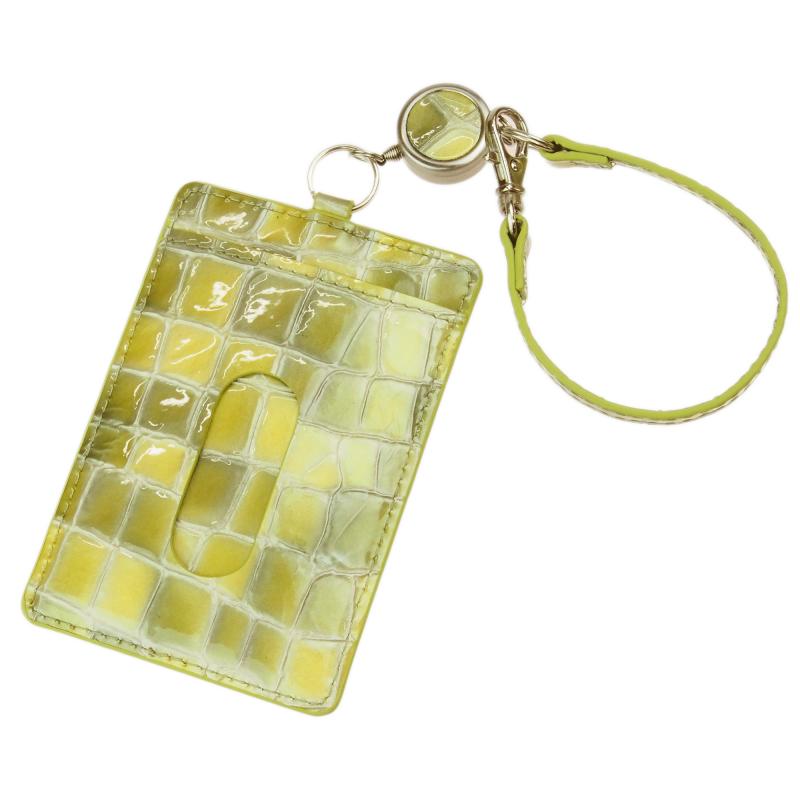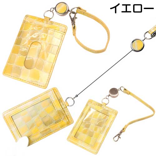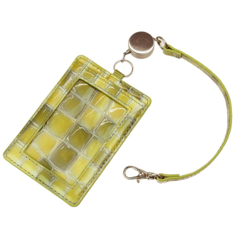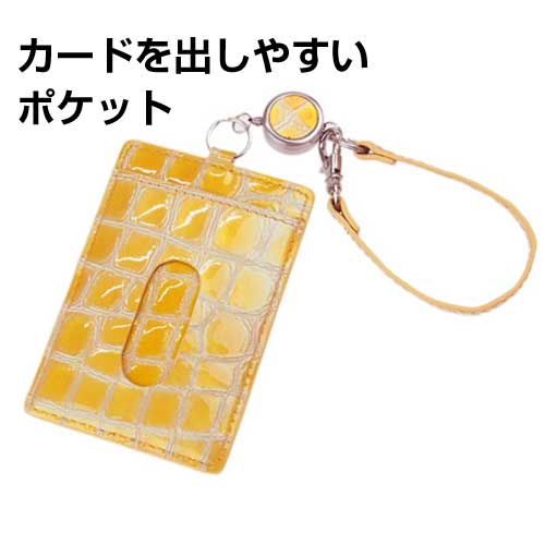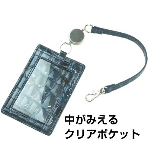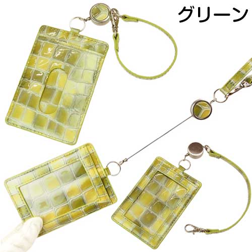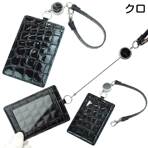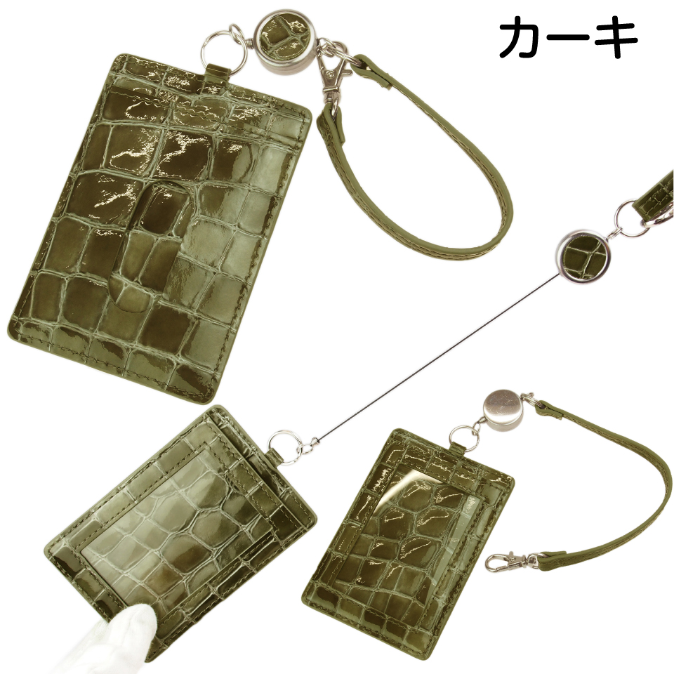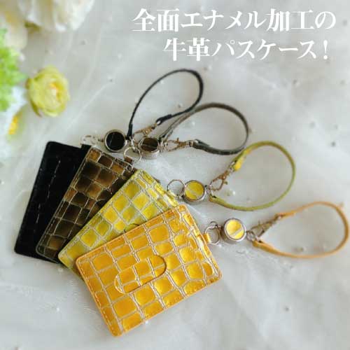 【メール便送料無料】パスケース 定期入れ カードホルダー エナメル加工 本革 牛革 イタリアンレザー クロコ調型押し リール付き ストラップ付き カワノバッグ No.01126