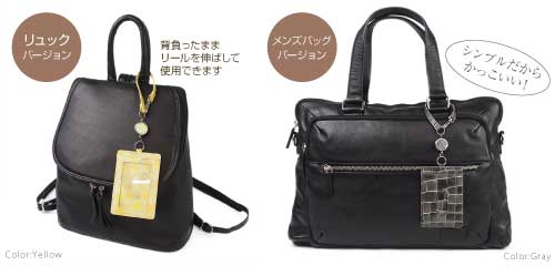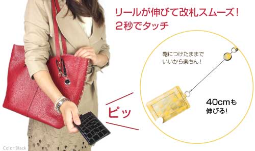 引っ張ると最大で40cmほど伸びるリールが装備されています。鞄にパスケースを取り付けているときに、鞄から外さなくてもリールを伸ばせば改札タッチが可能です。ICカードを探す時間が省かれ、スマートに行動することができます。電車に乗り遅れそうなときにも大活躍です。リールホルダーの表側にはお揃いの共革があしらわれています。