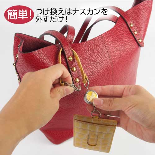 ナスカン部分は簡単に外すことができるので、鞄を変えた際の付け替えもすぐにできます。鞄のハンドルなど好きなところに掛けることができ、いちいち探さなくて良いので、鞄の中で迷子にならずすぐにみつけられます。ストラップにはお揃いのエナメル牛革が使われています。