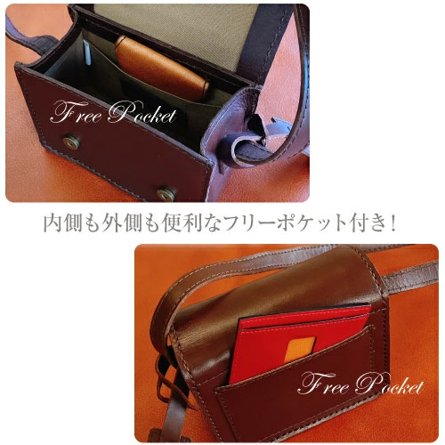小ぶりな造りですが中にフリーポケットがついているので、整理することができます。またポケットの部分には革に型押しされたカワノバッグのロゴが付いています。