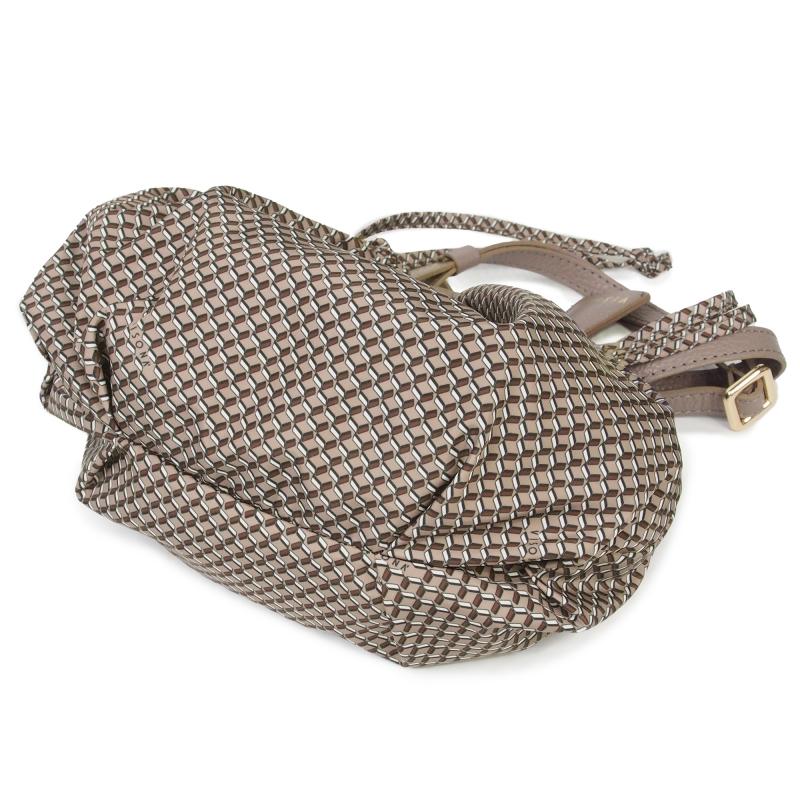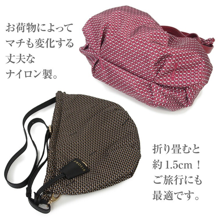 汚れにくくかつ軽いナイロン素材ながら、程よいハリと硬さでしっかりとした形状を保つので、荷物の出し入れもしやすい造りです。 形も荷物の量やTPOによって変えられ、半月型でそのまま使えたり、また紐を引っ張り巾着型にしてコンパクトで上品なシルエットにもできます。様々なスタイルをお楽しみいただけます。